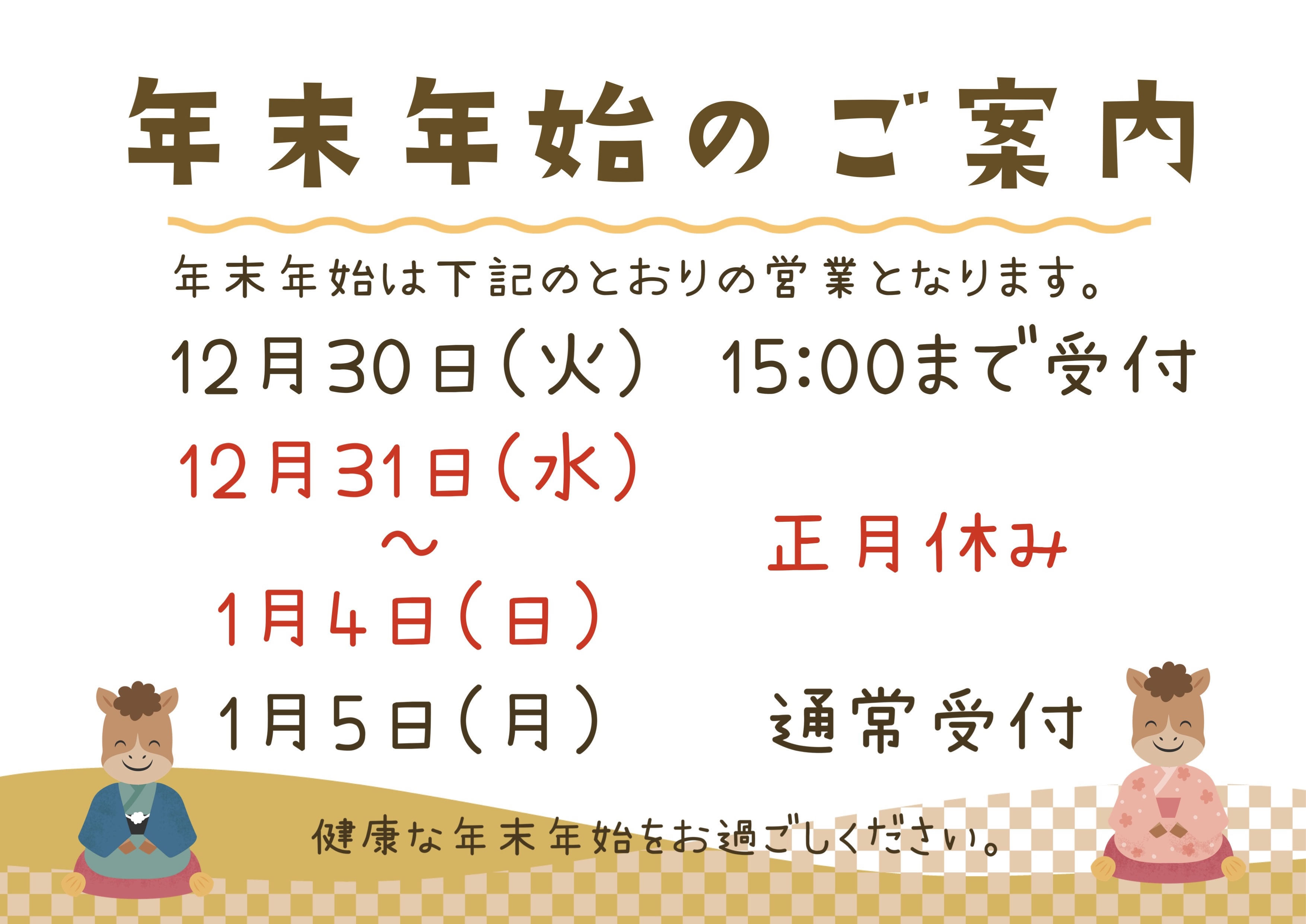 ◎年末年始のご案内 P 2025年12月15日 , by nisisinkoiwa-staff-admin K NEWS, ブログ c No comment ◎年末年始のご案内 12/30(火) 15:00までの受付 12/31(水)~1/4(日) 正月休み 1/5(月) 通常診療 となります。 12/30(火)と1/5(月)はご予約が埋まりやすいと予想されますので、お早めのご予約をお願いいたします。