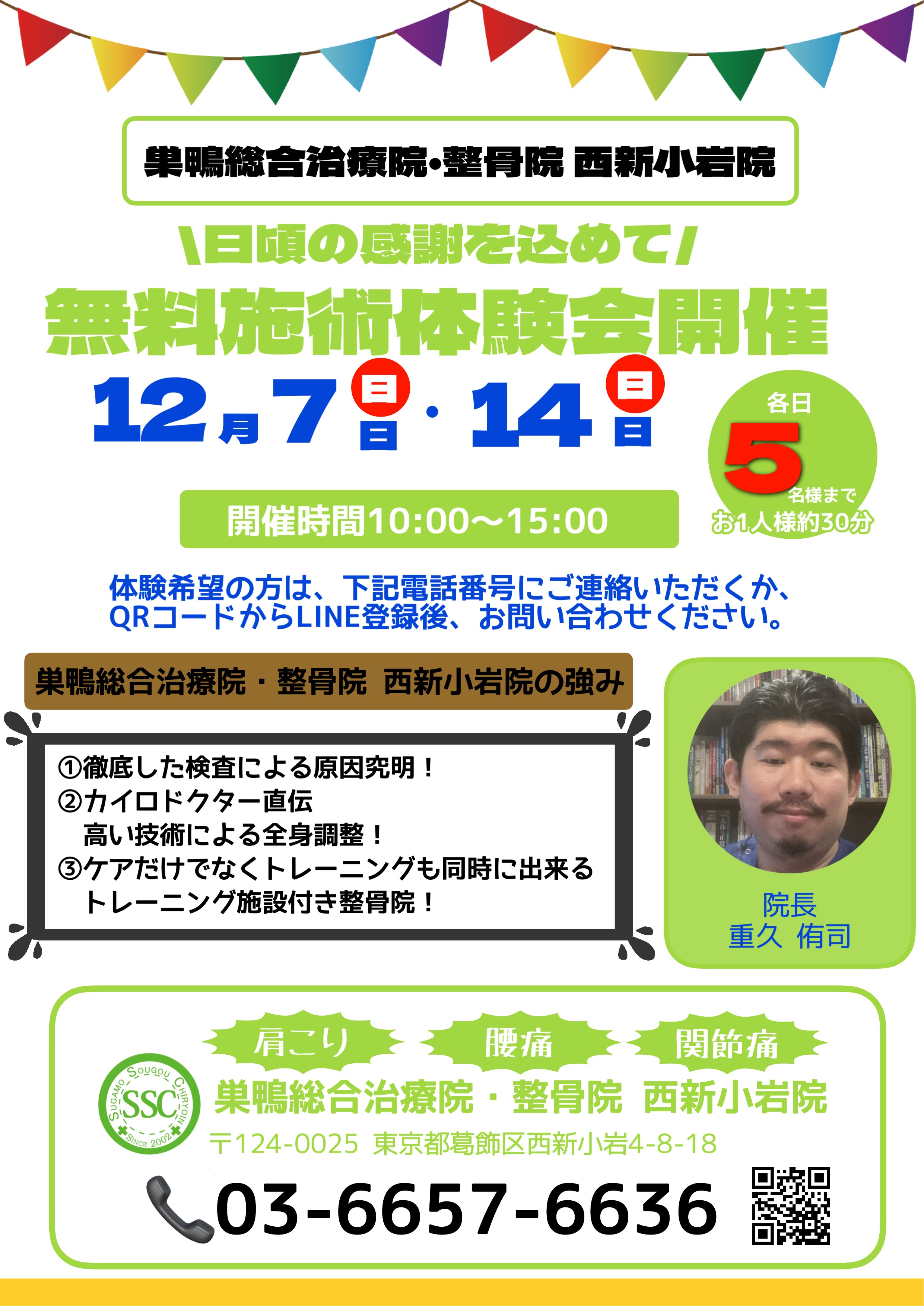 ⑤受付方法:お電話で03-6657-6636までご連絡いただくか、こちらの「巣鴨総合治療院・整骨院 西新小岩院 | LINE 公式アカウント」を登録していただいて、「無料治療体験会希望」とお伝えください。