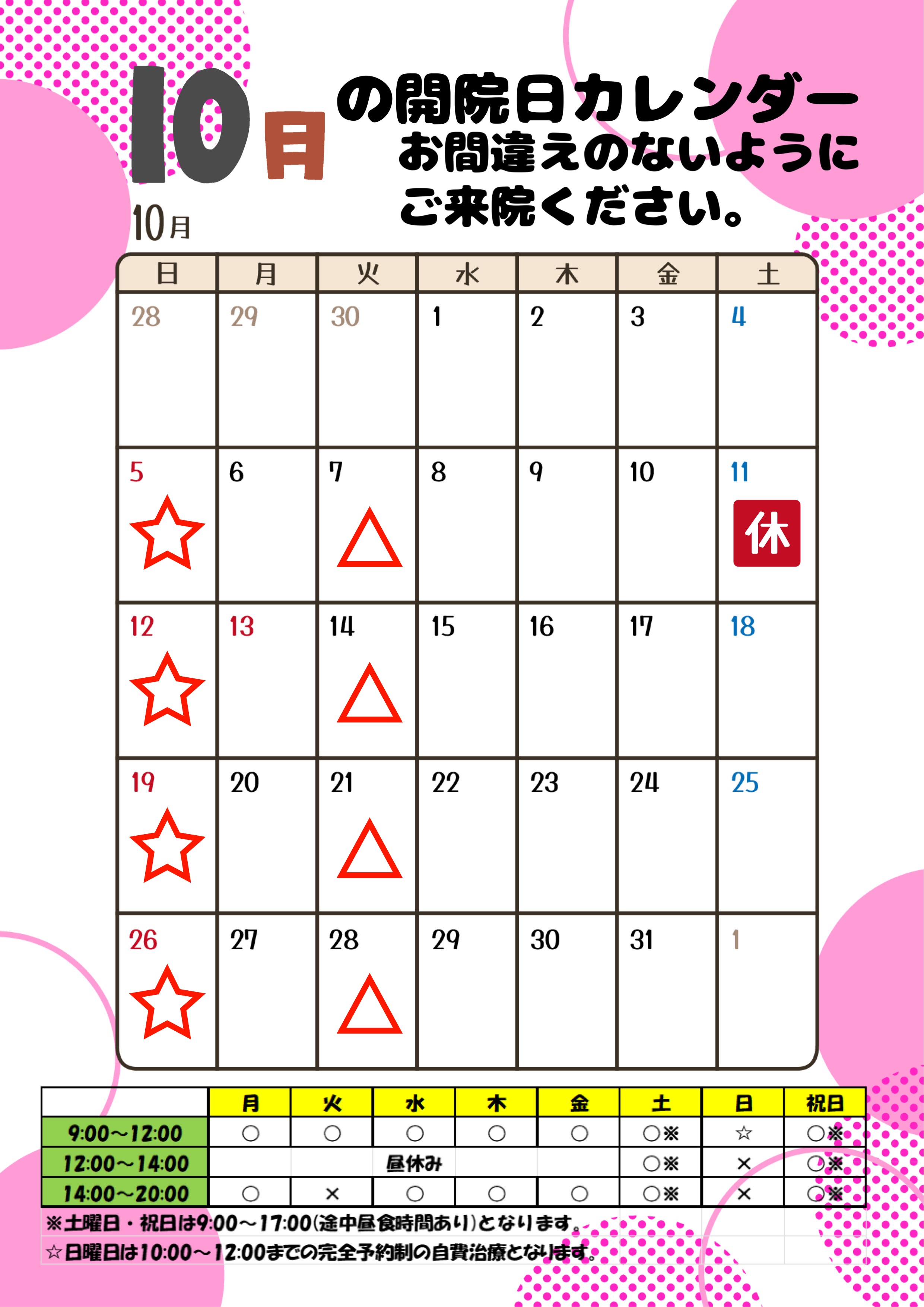 10/13(月)はスポーツの日のため、9:00~17:00(途中昼食時間あり)の祝日診療となります。