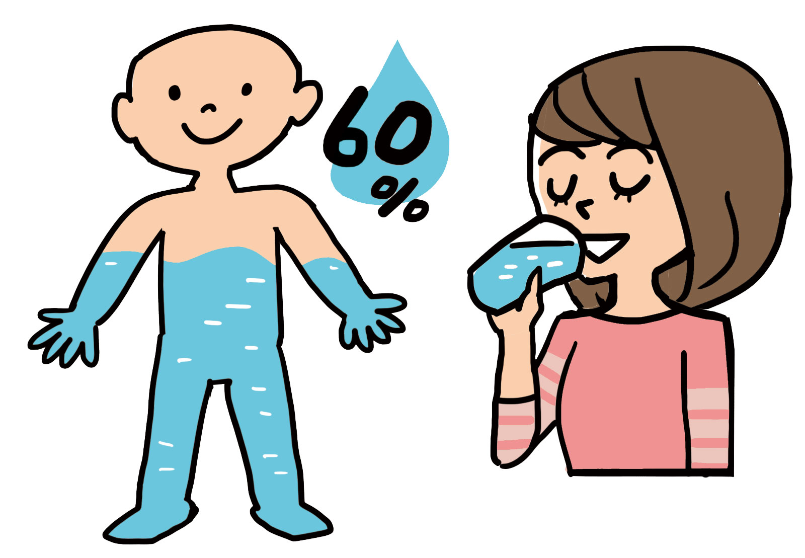 人間の身体は60%以上が水分で出来ています。血液も水から造られるので、体内に水分が足りないと、血液がドロドロになり、うまく循環せず、回復力が低下します。また、筋肉も60%が水分で出来ているため、水分が不足すると、筋肉が干からびて硬くなってしまいます。
