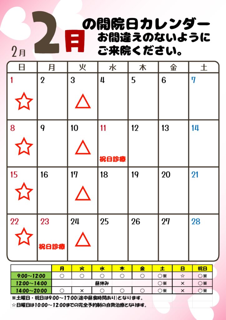 2/11(水)、23(月)は祝日のため9:00~17:00(途中昼食時間あり)の祝日診療となります。