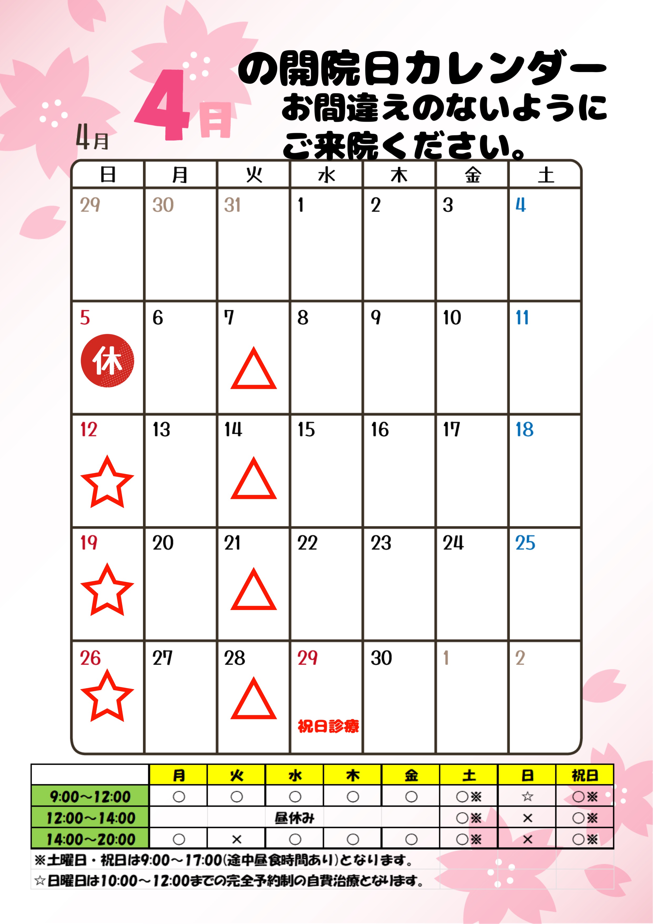 4/29(水)は祝日のため9:00~17:00(途中昼食時間あり)の祝日診療となります。